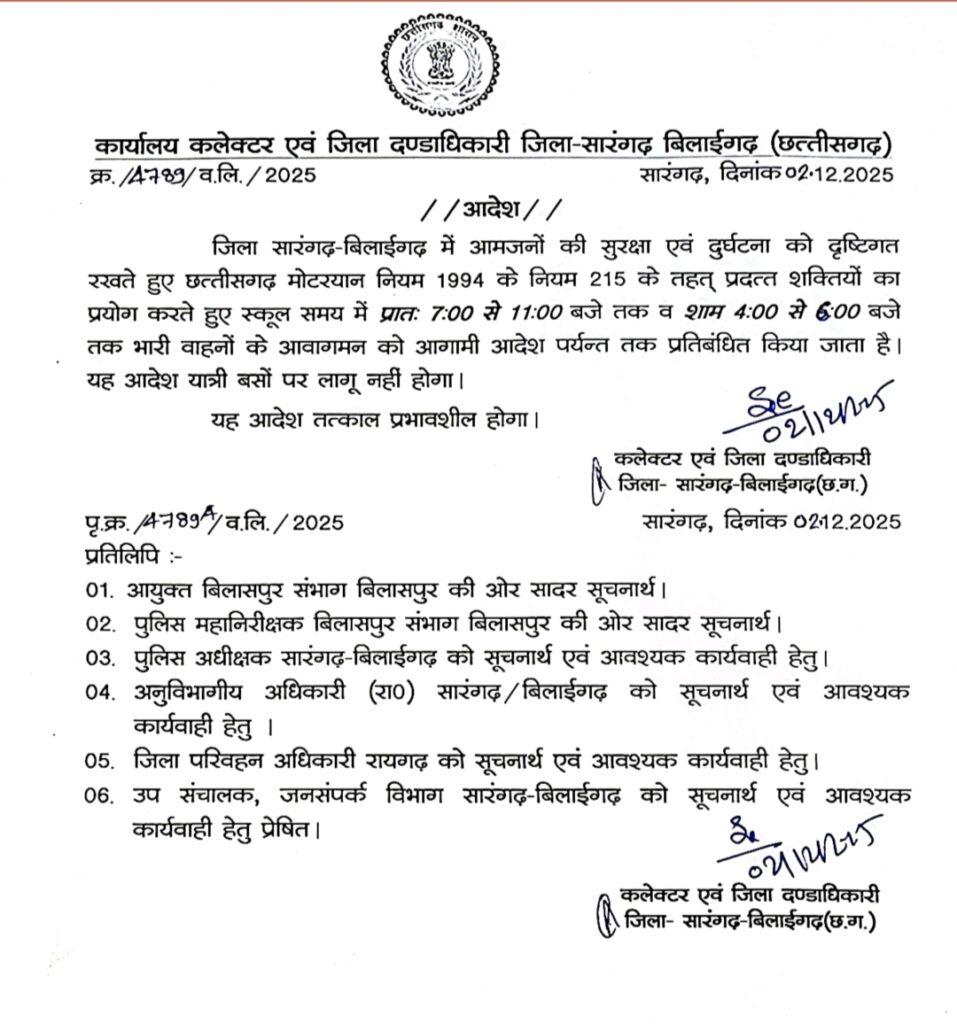 सारंगढ़-बिलाईगढ़, 4 दिसंबर 2025/कलेक्टर एवं जिला दंडाधिकारी डॉ संजय कन्नौजे ने सारंगढ़ बिलाईगढ़ जिले के आम जनों की सुरक्षा एवं दुर्घटना से बचाव को ध्यान में रखते हुए छत्तीसगढ़ मोटरयान नियम 1994 के नियम 215 के तहत प्रदत्त शक्तियों का प्रयोग करते हुए स्कूल समय में प्रातः 7 से 11 बजे तक और शाम को 4 से 6 बजे तक भारी वाहनों के आवागमन को आगामी आदेश पर्यंत तक प्रतिबंधित किया है। यह आदेश यात्री बसों को छोड़कर बाकी सब भारी वाहनों पर तत्काल प्रभाव से लागू होगा।