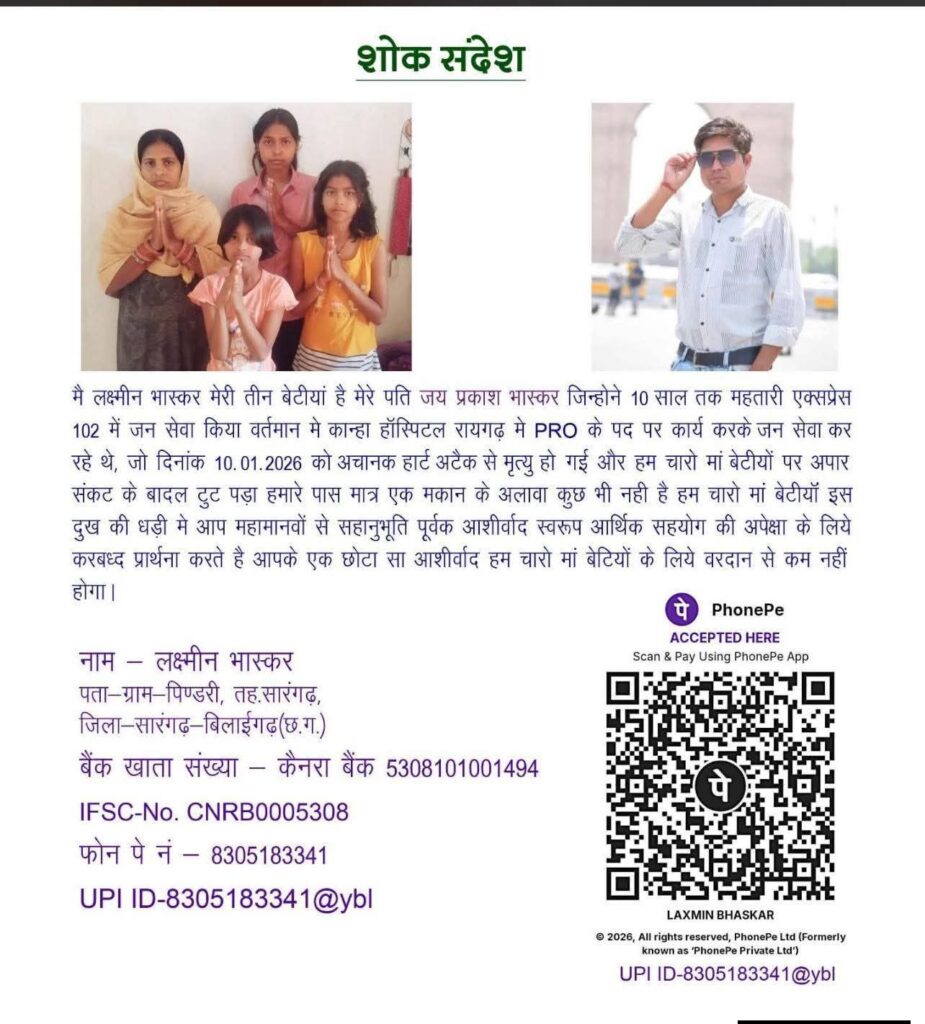 सारंगढ़-बिलाईगढ़ जिले के ग्राम पिण्डरी निवासी स्वर्गीय जयप्रकाश भास्कर का दिनांक 10 जनवरी 2026 को अचानक हृदयाघात से असामयिक निधन हो गया। यह खबर न केवल उनके परिवार, बल्कि पूरे क्षेत्र के लिए गहरा आघात है। जयप्रकाश भास्कर जी ने महतारी एक्सप्रेस 102 में लगातार 10 वर्षों तक निस्वार्थ भाव से जनसेवा की। वर्तमान में वे कान्हा अस्पताल, रायगढ़ में PRO के पद पर कार्यरत थे और पूरी निष्ठा से समाजसेवा में लगे हुए थे।